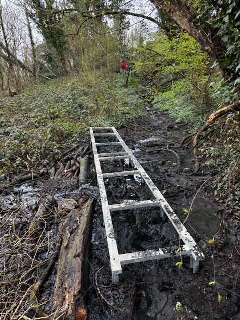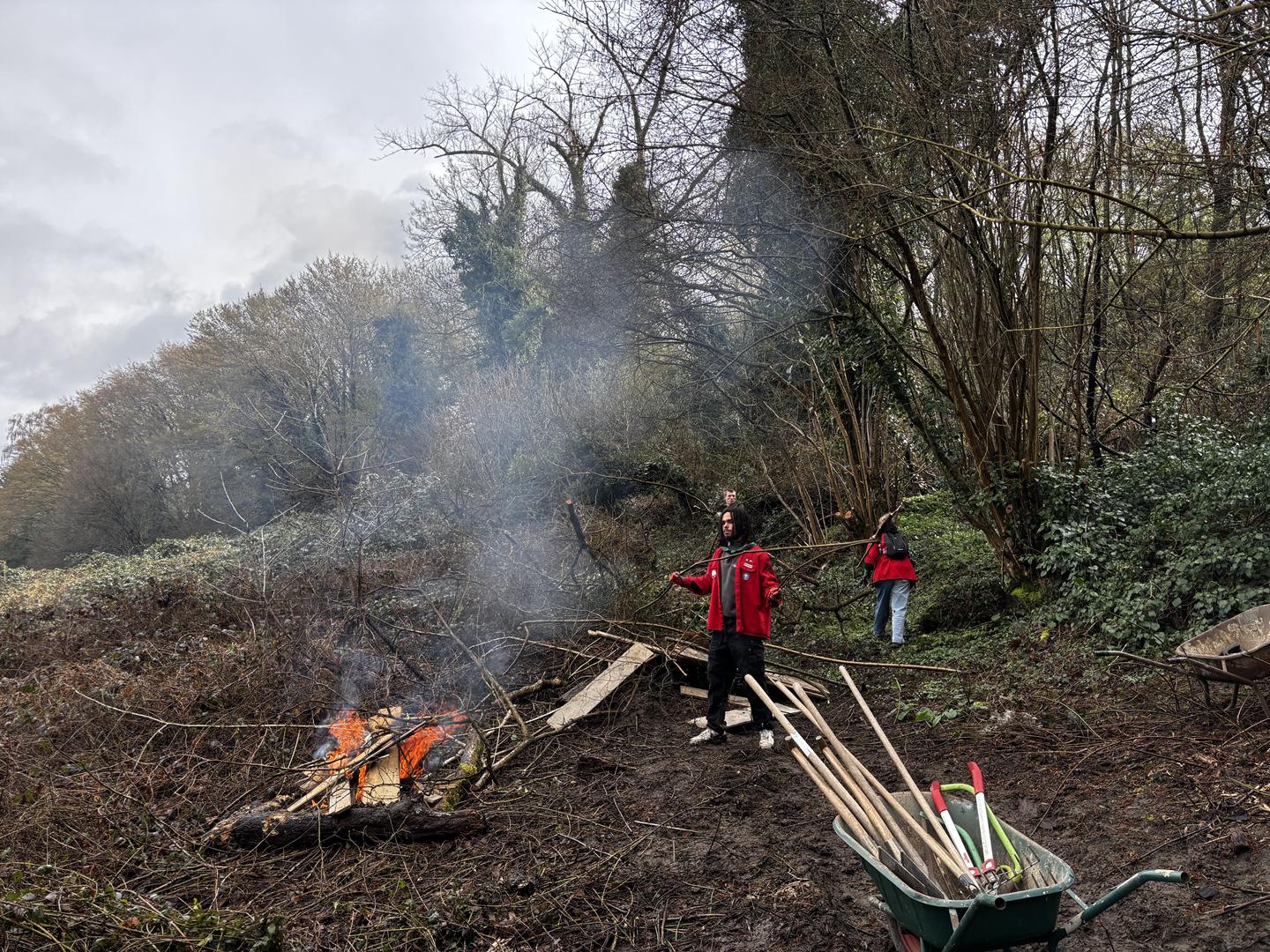 Grâce à un bon feu,les nombreux déchets de bois ont été éliminés, les plus gros ont été déplacés et stockés sur place, laissant la nature faire son œuvre. On a également profité de leur présence pour placer une passerelle en acier galvanisé sur le haut du chemin, afin de pouvoir traverser une zone boueuse au sec ! Il manquait malheureusement quelques bras supplémentaires pour dégager le chemin jusqu’à la rue des Grands Escaliers (anciennement Hayettes).