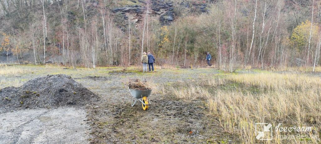 Une autre tâche est de limiter l’expansion des calamagrostis (sorte de graminée envahissante). Lors de la dernière gestion nous avons procédé à un essai d’étrépage : une bande de gravillons a été retirée à l’aide de la benne du tracteur. Ce matin nous avons profité du temps humide pour dégager les graminées du tas et procéder à un nouvel essai sur la bande parallèle en retirant à la main les calamagrostis présents en touffes.