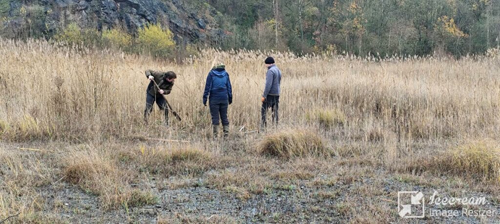 Une première équipe, les « mieux bottés » se sont attaqués aux ligneux de la grande roselière qui font concurrence aux phragmites australis présents dans ce milieu humide. Ces jeunes arbres risquent en effet de pomper trop d’eau et de mettre à sec la roselière.